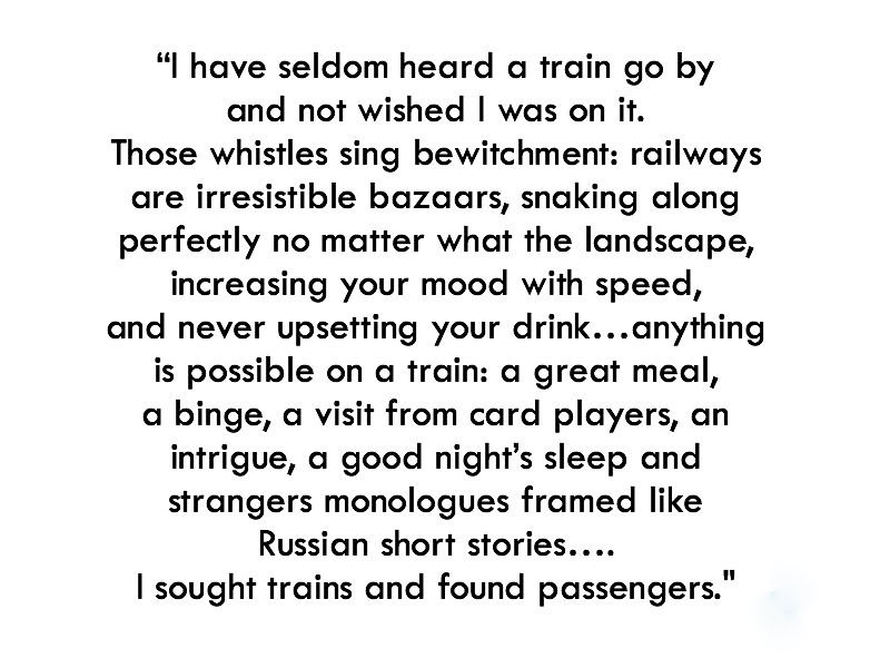 With such a grand opening Paul Theroux enfold the endless possibilities a train travel can confer. In his travelogue Great Railways Bazaar the writer narrates his four-month journey crisscrossing Europe to Asia murdering miles on trains, namely The Orient Express, The Khyber Pass Local, The Delhi Mail, The Golden Arrow of Kuala Lampur and the Trans-Siberian Express, meeting passengers who are telltale embodiments of their societies.