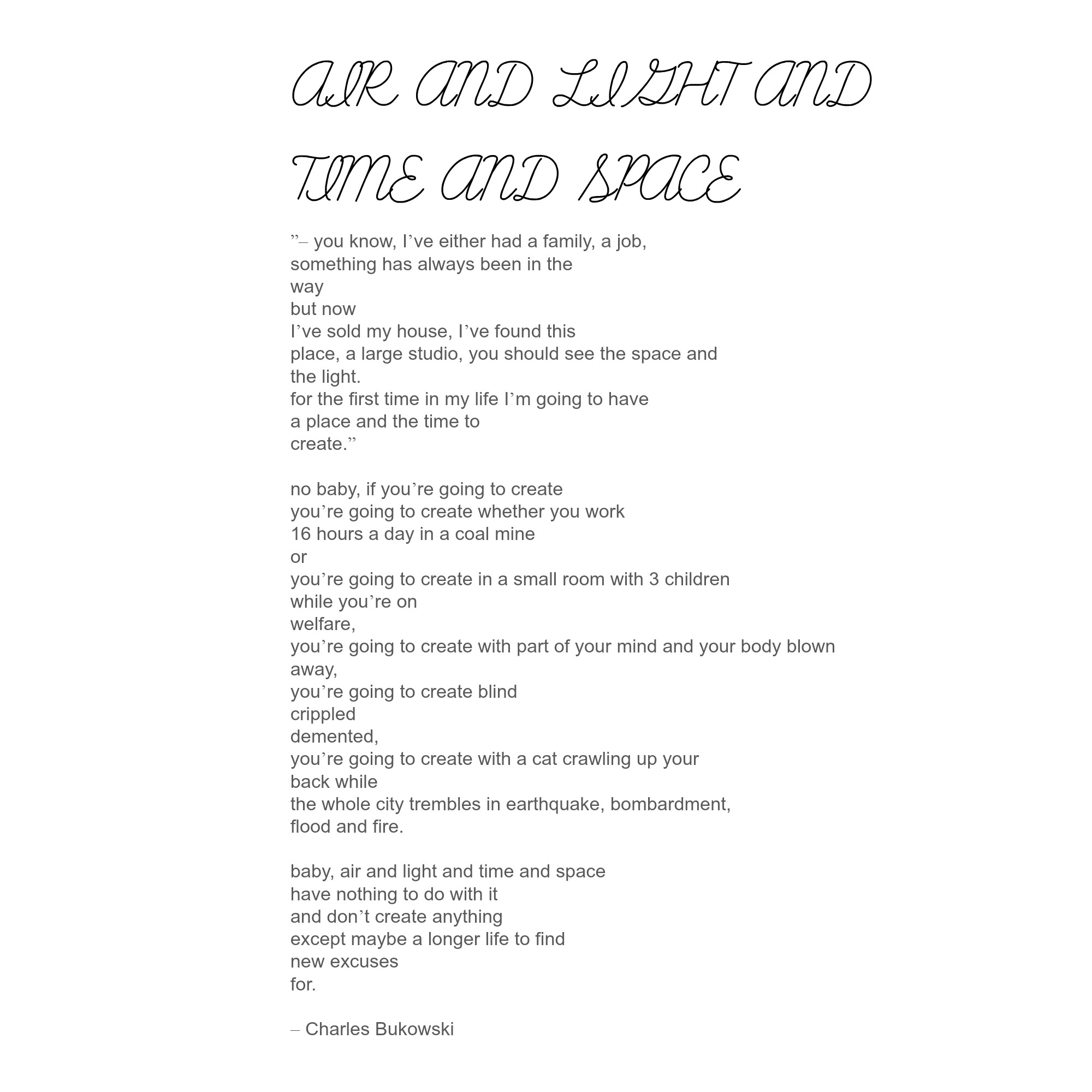 So while we are mulling over creating that perfect space for creative work to flow, let us not forget the timeless wisdom of Charles Bukowski: