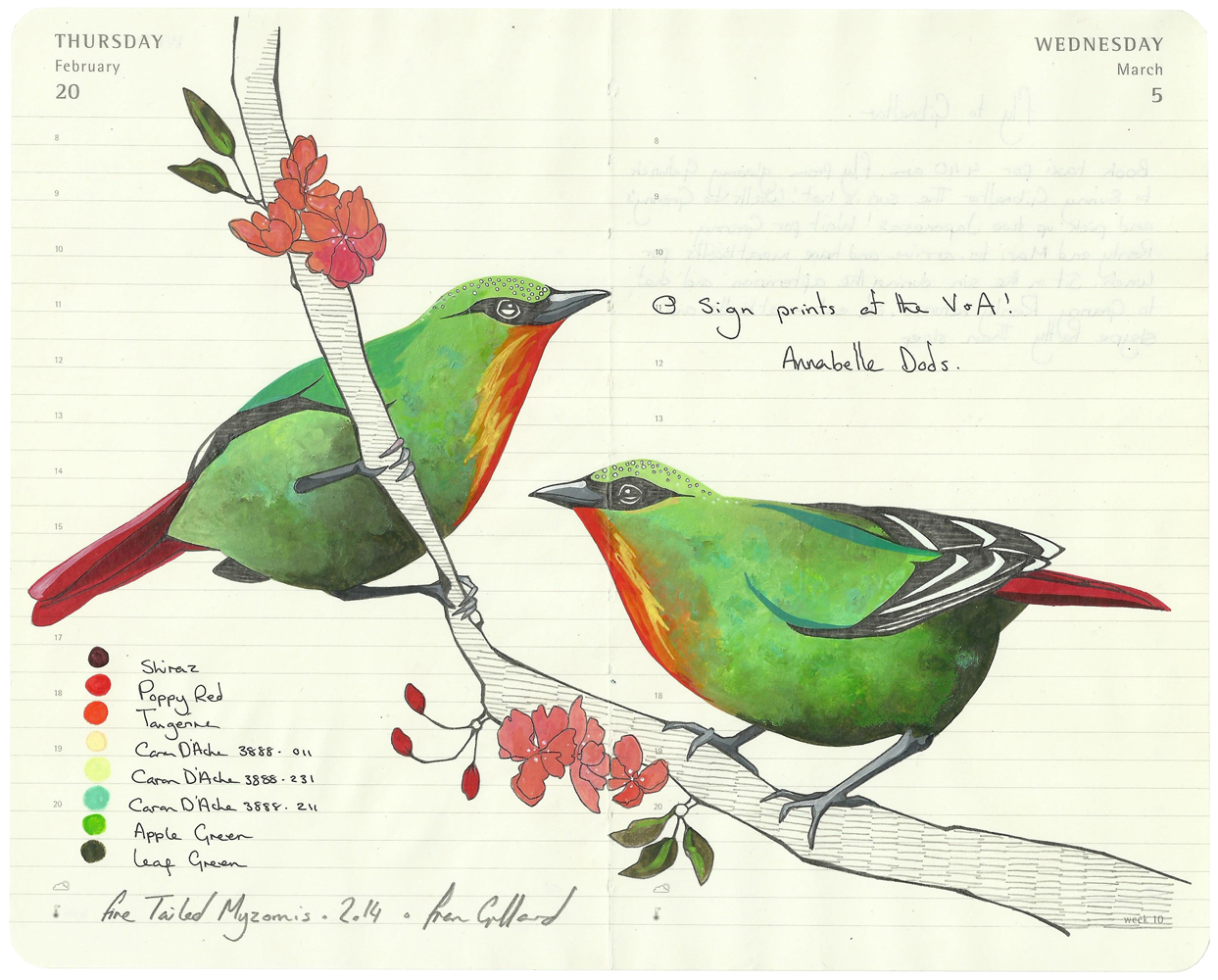 I was given an expensive sketchbook many years ago, and I wanted to fill it with drawings of birds from the Natural History Museum in London. However, I was so nervous at wasting the paper, that all of my drawings were tentative and bad. I decided to do some practice sketches using my Moleskine diary, and found I really liked the combination of my bird drawings along my notes and diary entries. I drew more confidently and enjoyed the compositional challenge of fitting drawings of birds in the spaces left by my notes.